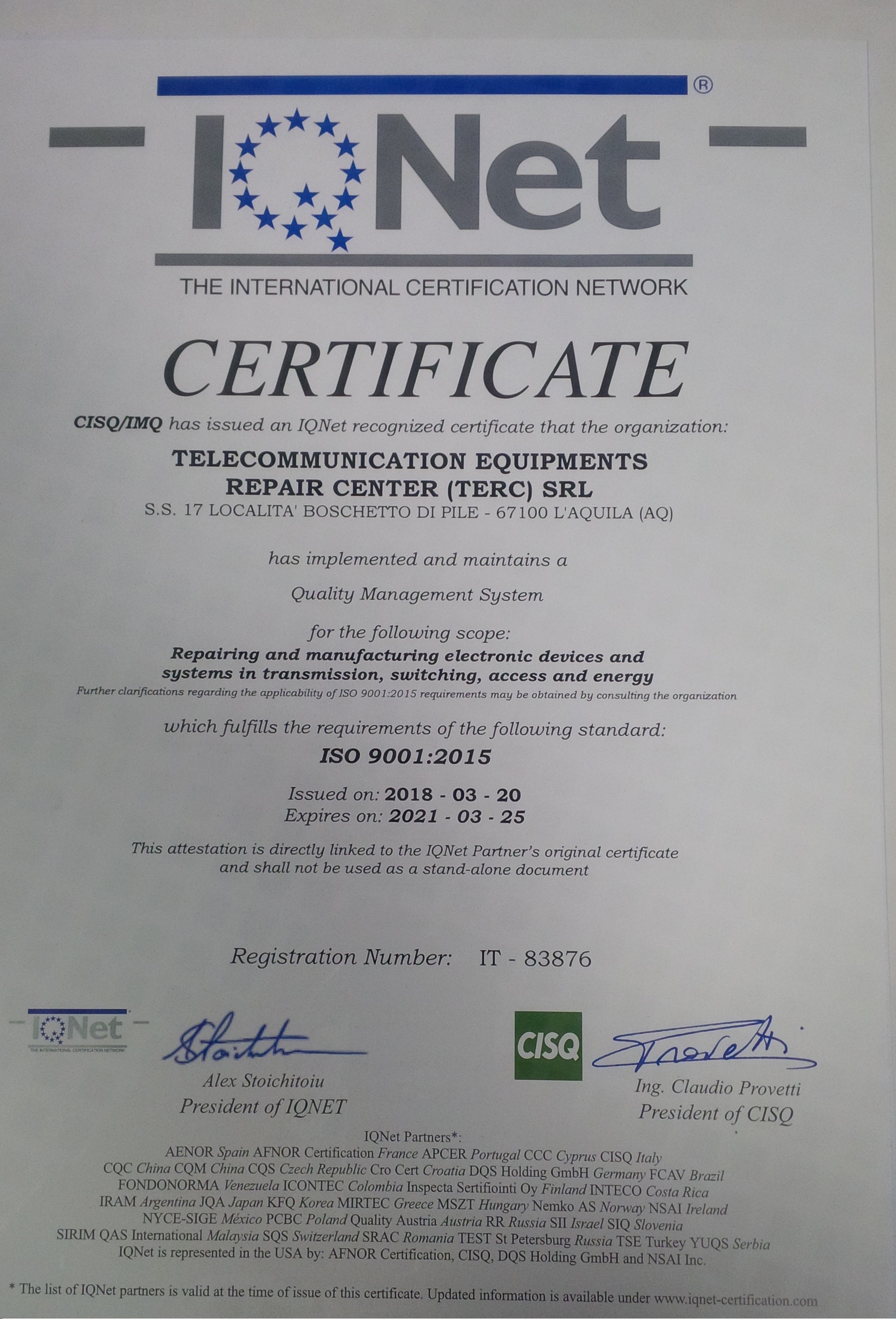 TERC is the result of spin-off about other business units, CNX-Siemens and Elind. Core-business is repair item belonging to SDH systems (Cross-Connect), PDH (RED), access systems (DSLAM, XDSL, S.A.F.), Switching (UT100), communication systems to wave conveyed analog and digital, Workstation and a variety of power supplies. The company is able to develop any automated test equipment (ATE) for functional test from customer supplied test specifications. The staff is highly skilled with over twenty years of experience in the telecommunications sector and particularly of broadcasts. The company it is able to provide services for the engineering and industrialization (with particular attention to the optimization of the final cost of the product), prototyping and small productions, whether they be about individual item that complex equipment, making it an ideal partner for research and development companies. From April 2011 TERC is part of the "Polo ICT Abruzzo", since May 2011 she is co-founder of the Enterprise Network-Remote Monitoring to Innovate. In March 2013, TERC became part of the Abruzzo-Abruzzo Italy business internationalization hub, in the same year it was co-founder of the RipTel consortium (Provider of Assistance Services and Maintenance of Telecommunications Hardware Equipment). From May 2018 it becomes part of the domain "Domain Aerospace ICT Abruzzo" TERC is an ISO 9001 certified company Punctuality, dynamism and elasticity are our working philosophy.